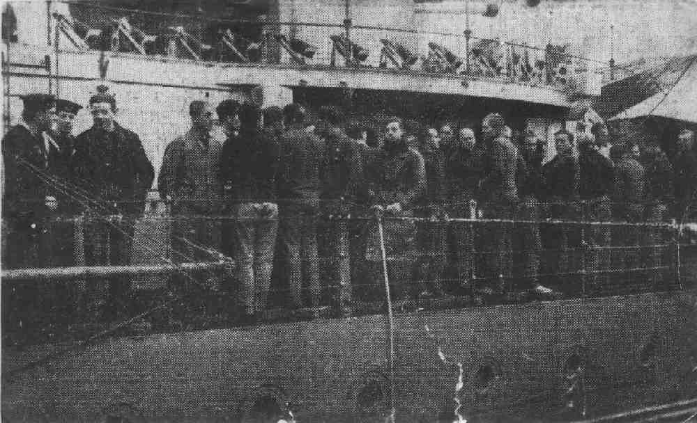 The crew of U-35 arriving in Glasgow as Prisoners of War. Heinz Küfner is the POW at left, talking with the two British sailors. [65]